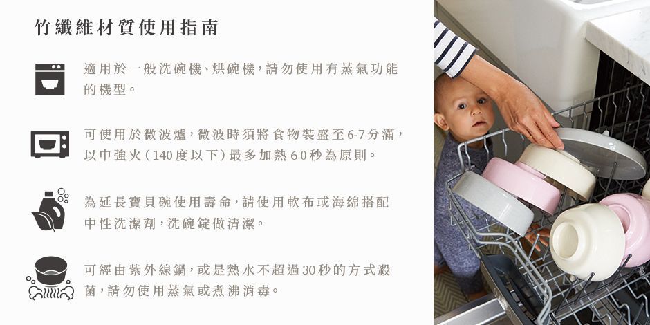 竹纖維材質屬天然材質,硬度仍不如陶瓷、金屬等餐具材質,使用洗碗機請與其他餐具分開擺放,避免洗碗機高速震動