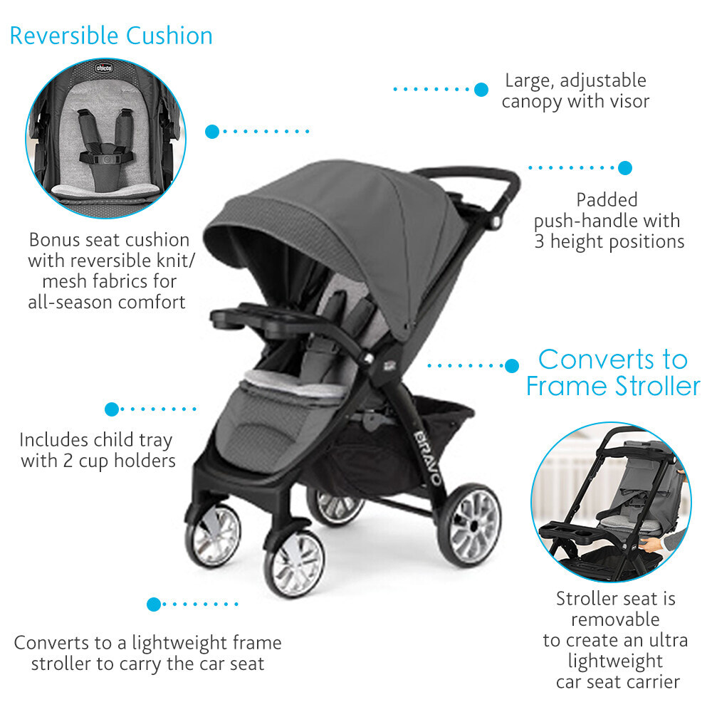 - Detachable stroller seat/canopy leave behind a lightweight car seat carrier