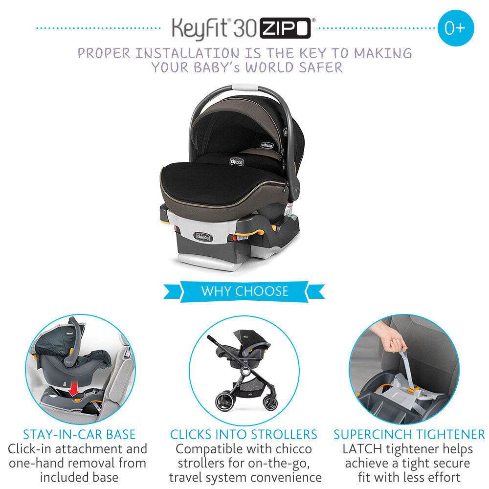 - Accepts all KeyFit®, KeyFit 30 car seats with click-in attachment