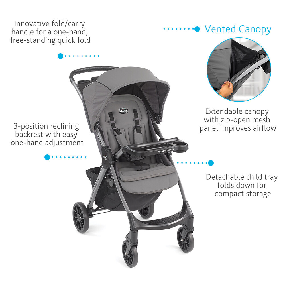 • Easy-grip handle and parent tray with two cup holders and zip storage