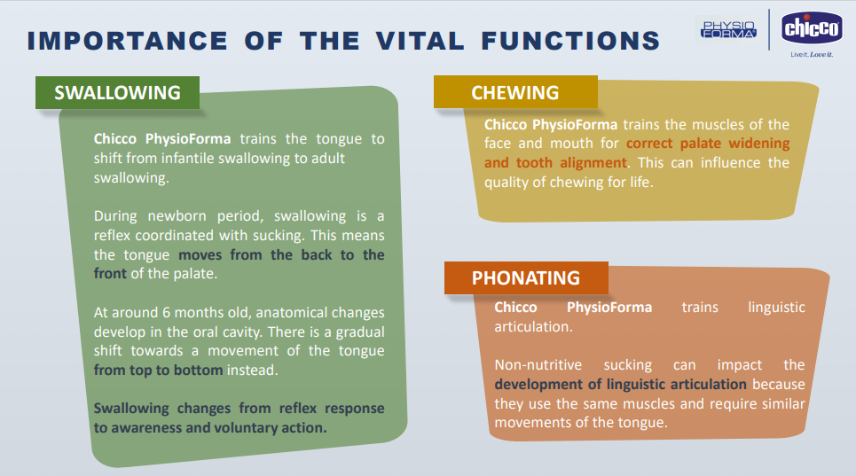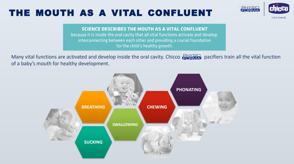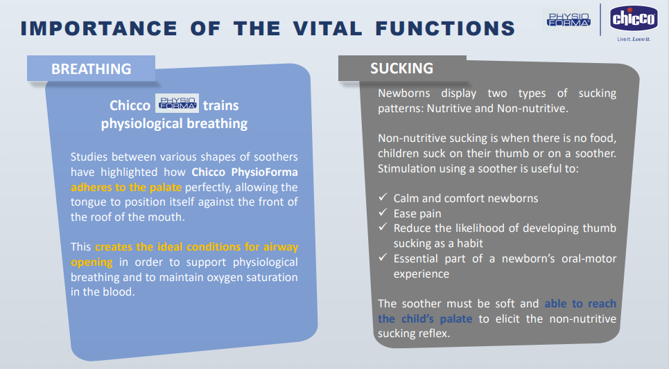Many vital functions are activated and develop inside the oral cavity. Chicco pacifiers train all the vital function